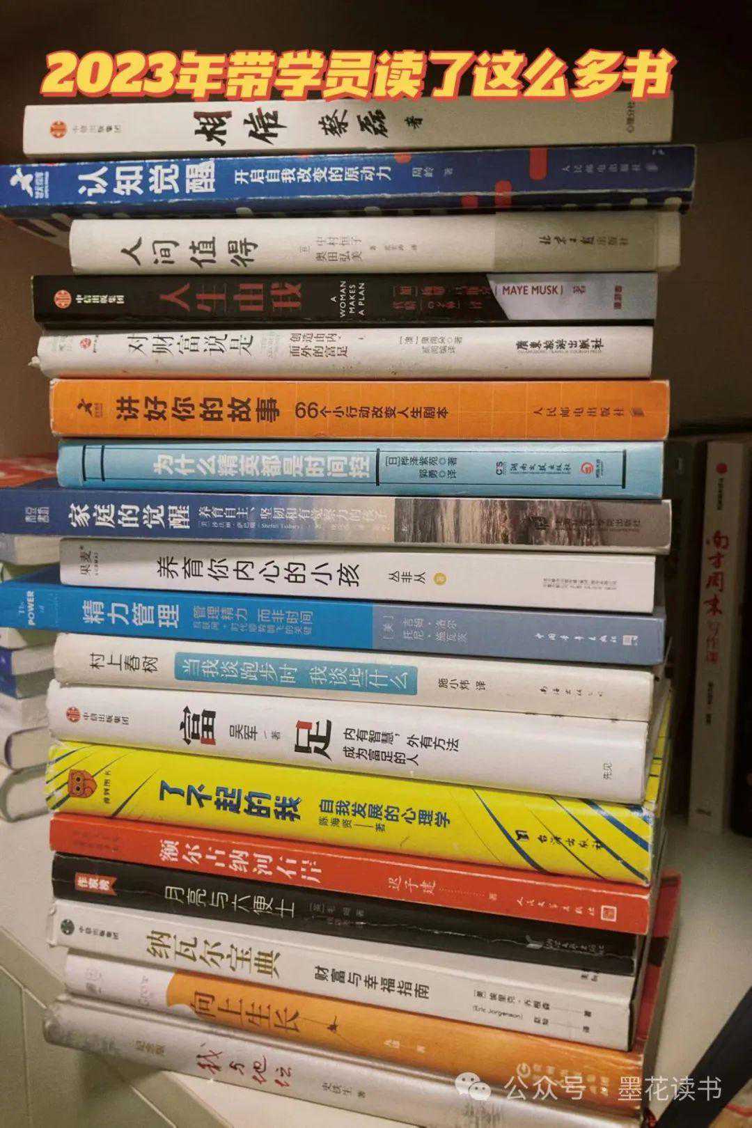 读《心流》《少有人走的路》《了不起的我》《当我谈跑步时,我谈些什么》,也读《自卑与超越》《也许你该找个人聊聊》《我们时代的神经症人格》,还读《认知觉醒》《向上生长》《讲好你的故事》等等。